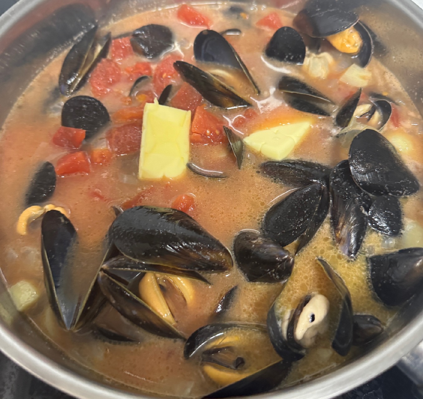 +화이트와인 100ml 넣고 뚜껑 덮고 끓임 (홍합이 입 벌림)