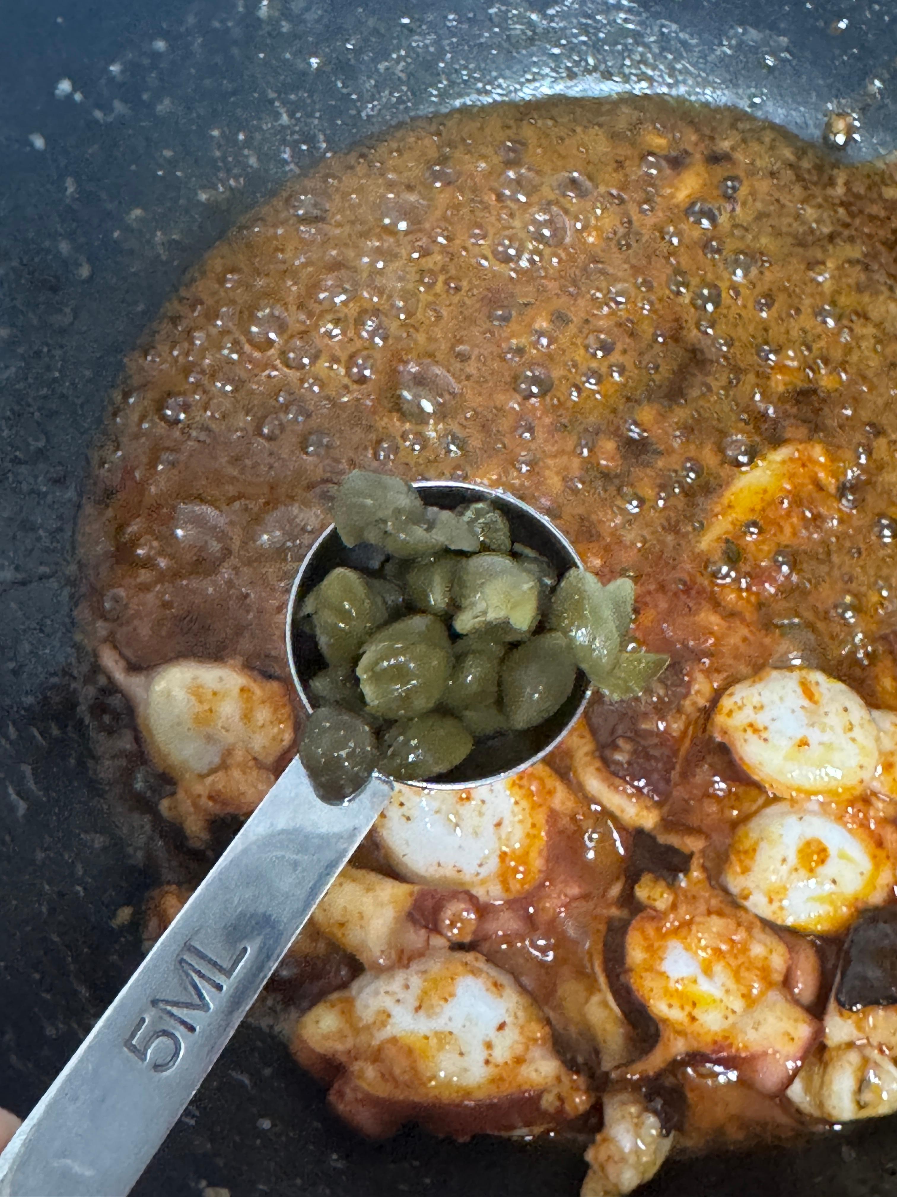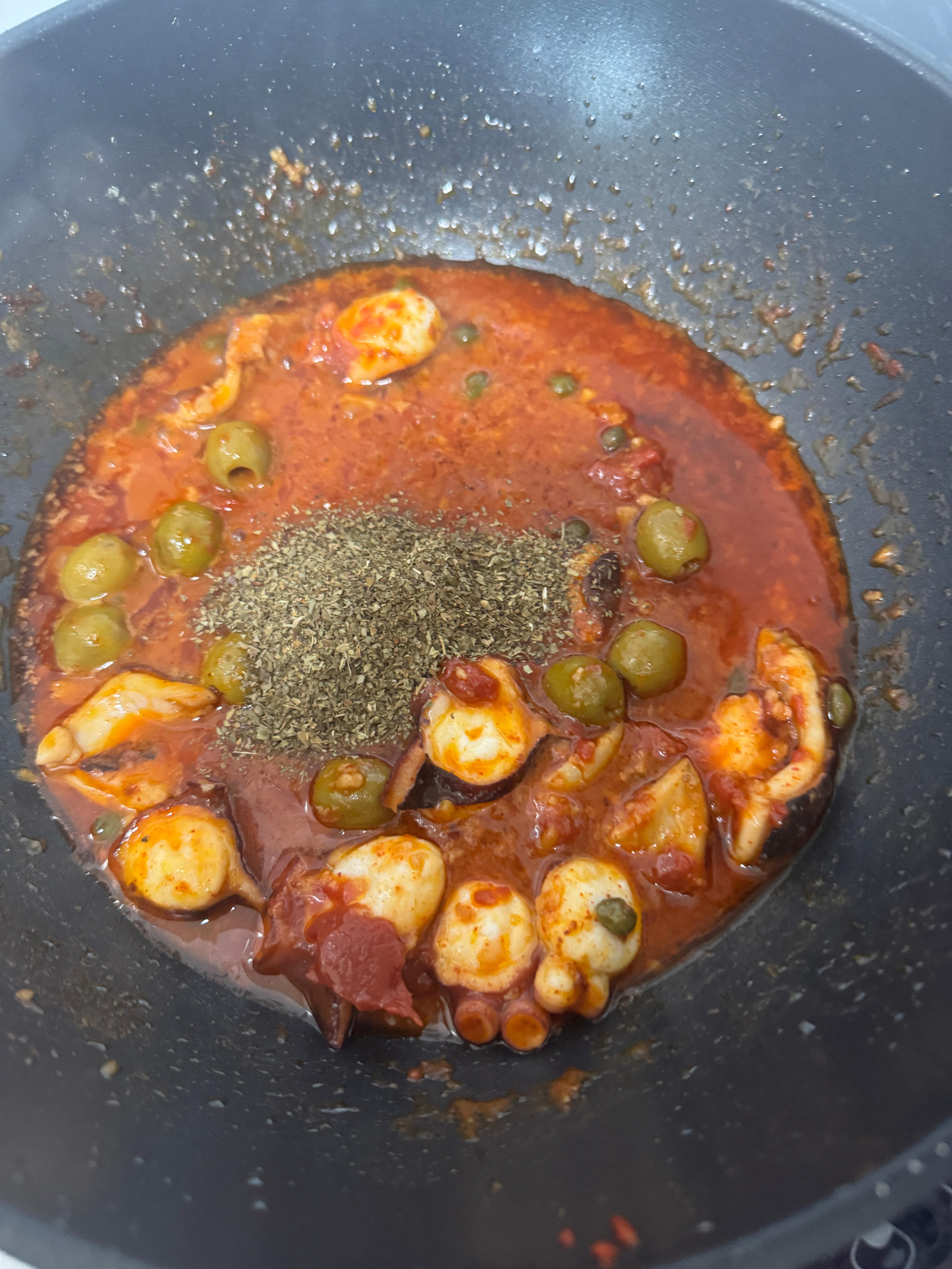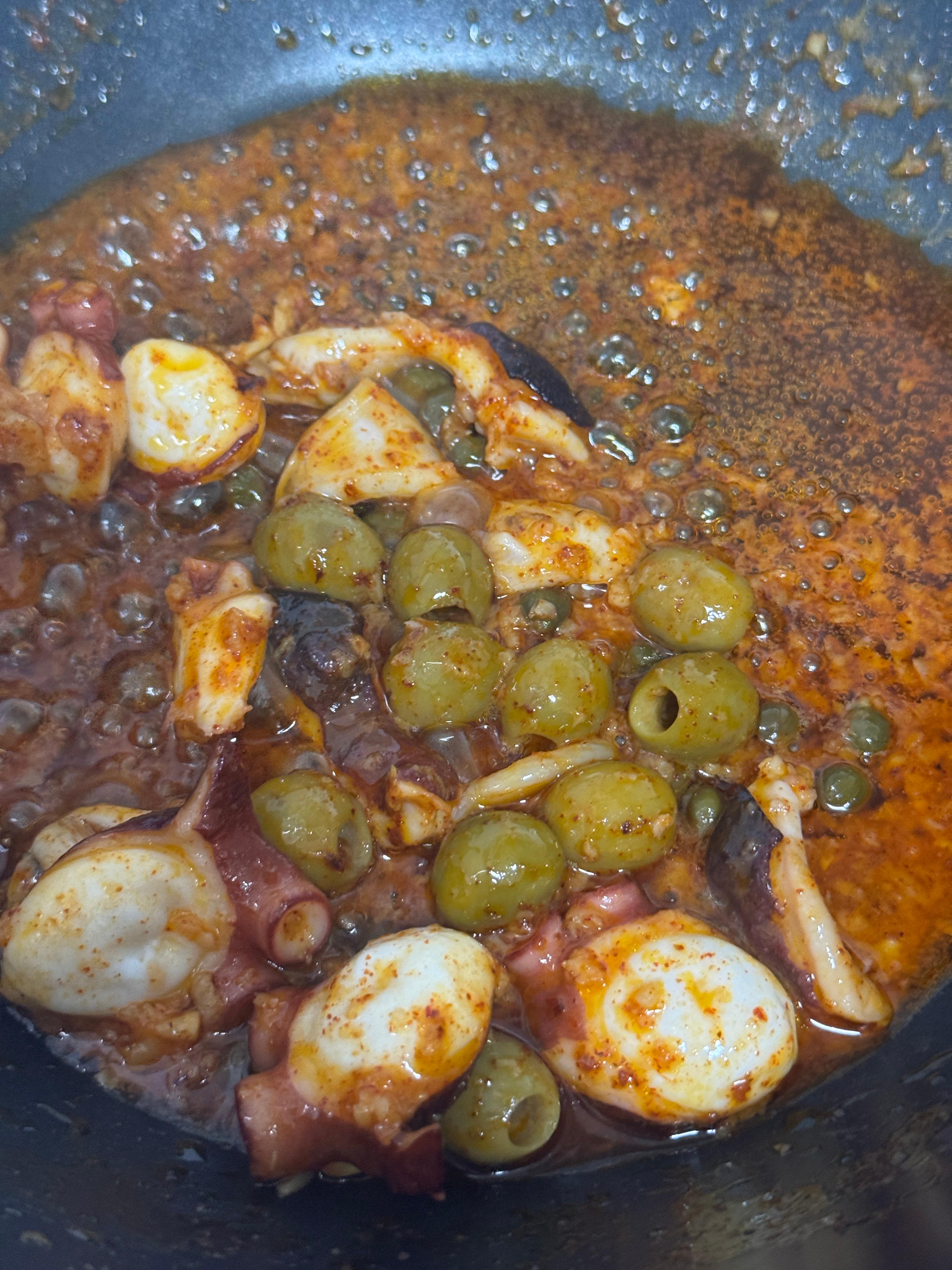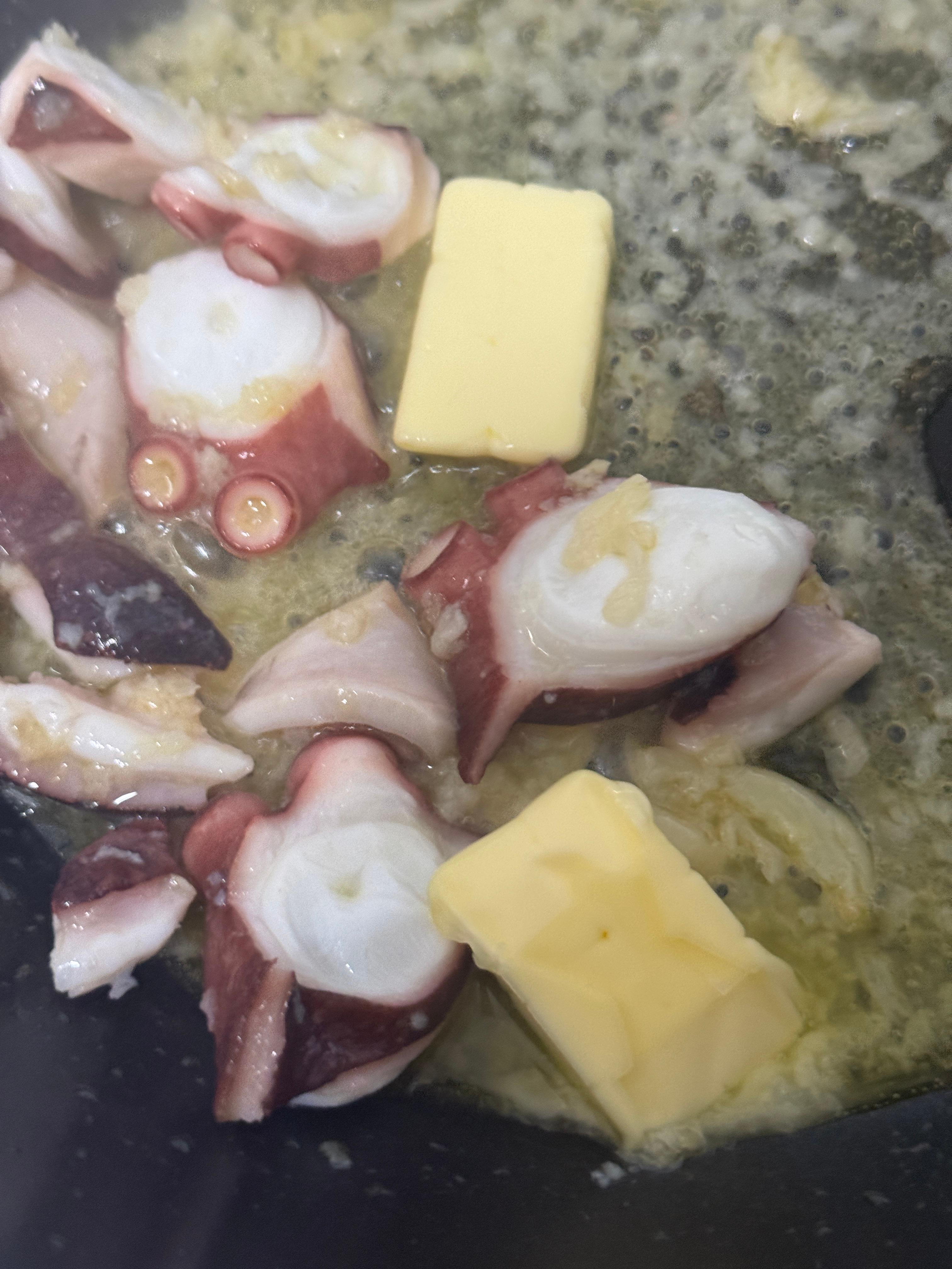 1.올리브유, 마늘5쪽 다진 것, 슬라이스된 문어, 알콜 30ml, 버터 20g