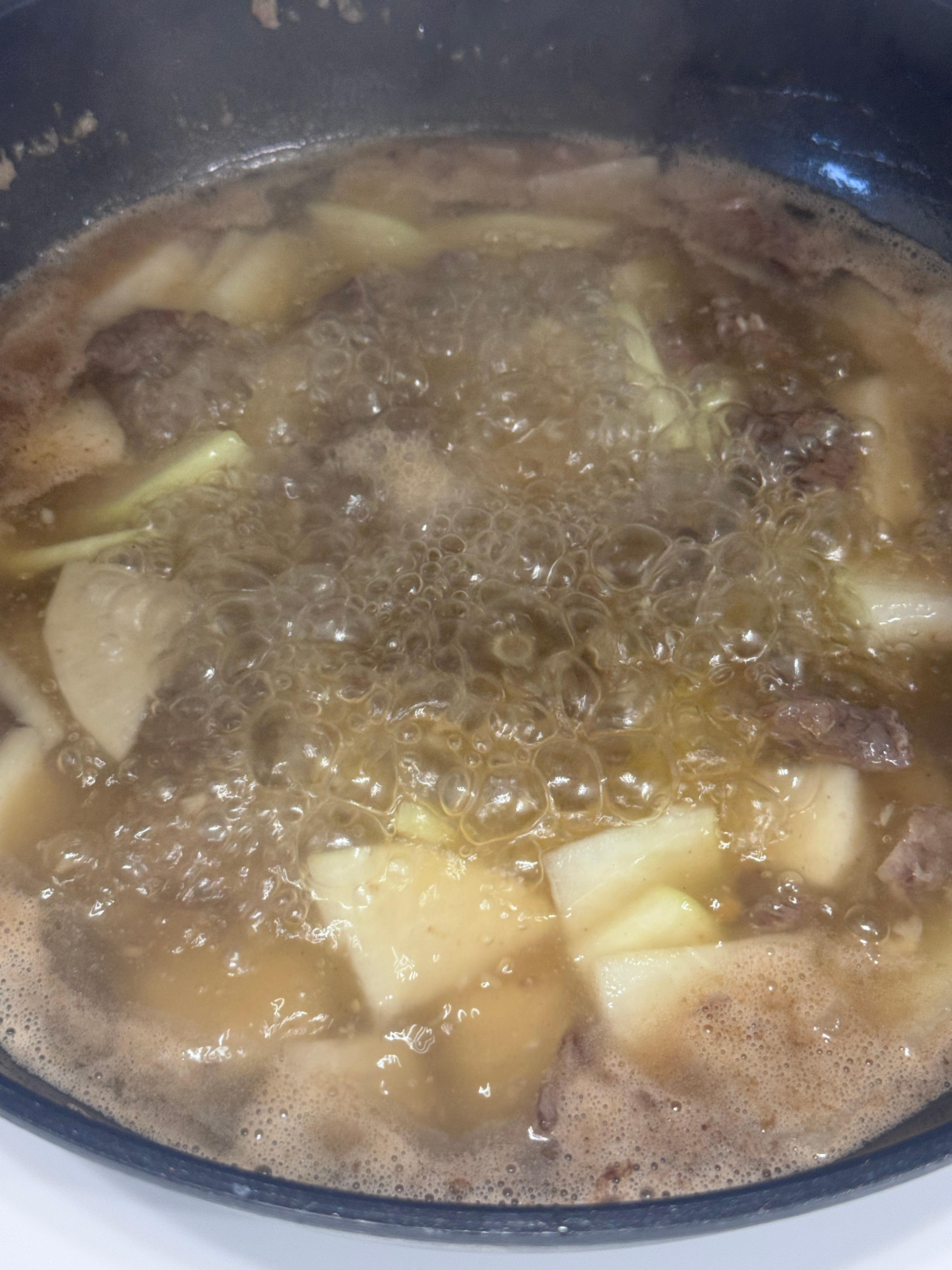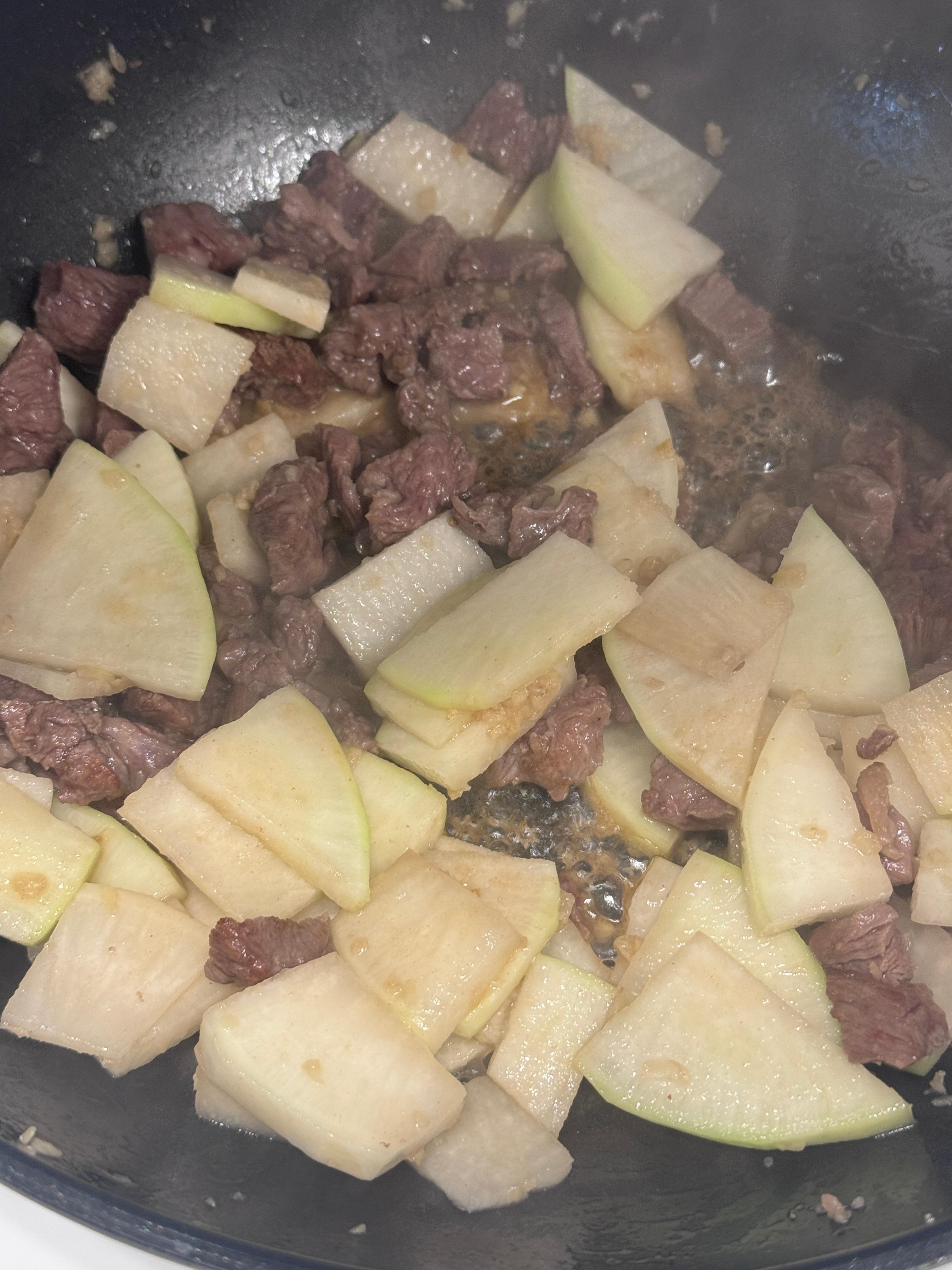 4.고기가 어느정도 익으면 잘라놓은 무우를 넣고