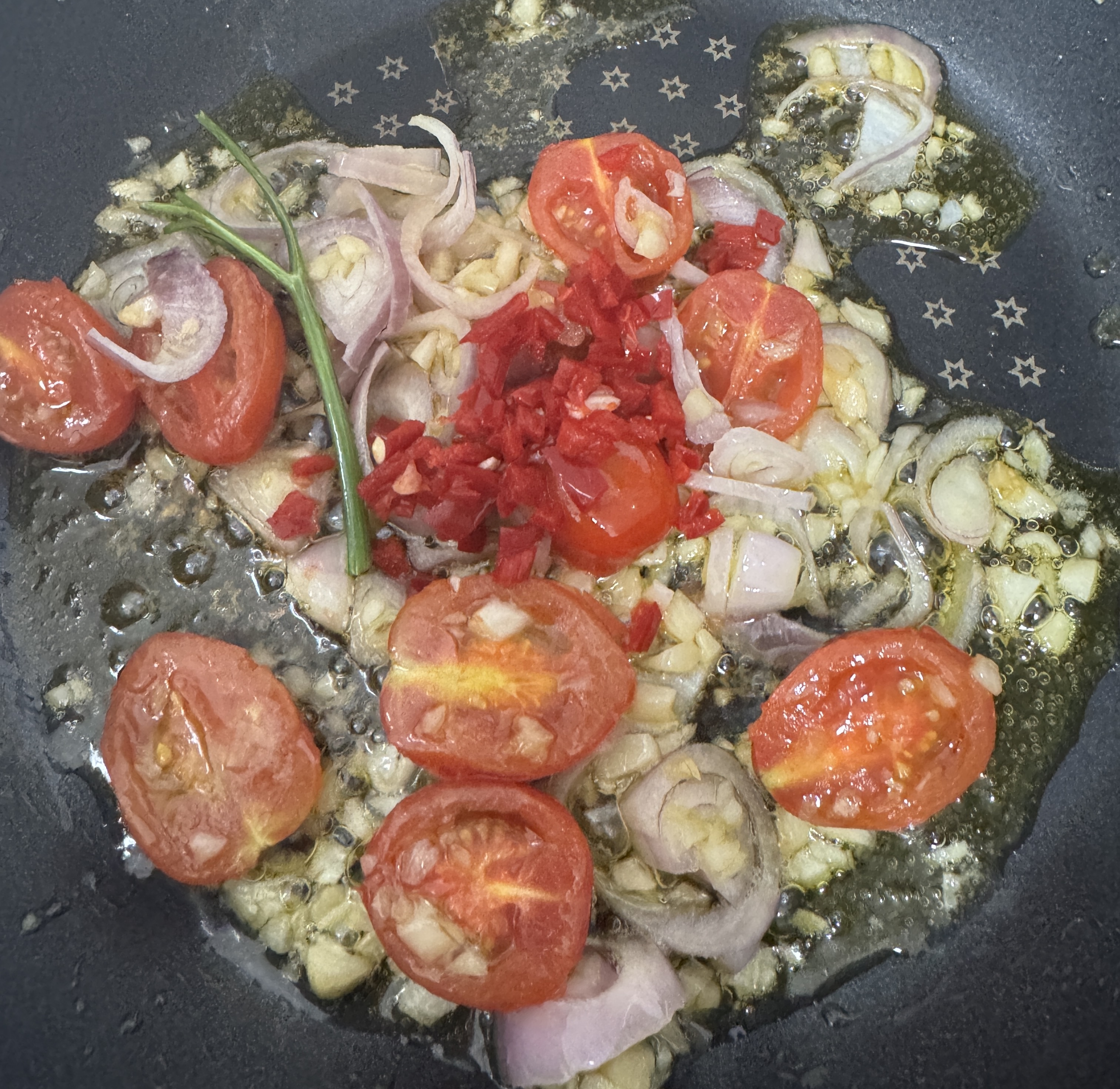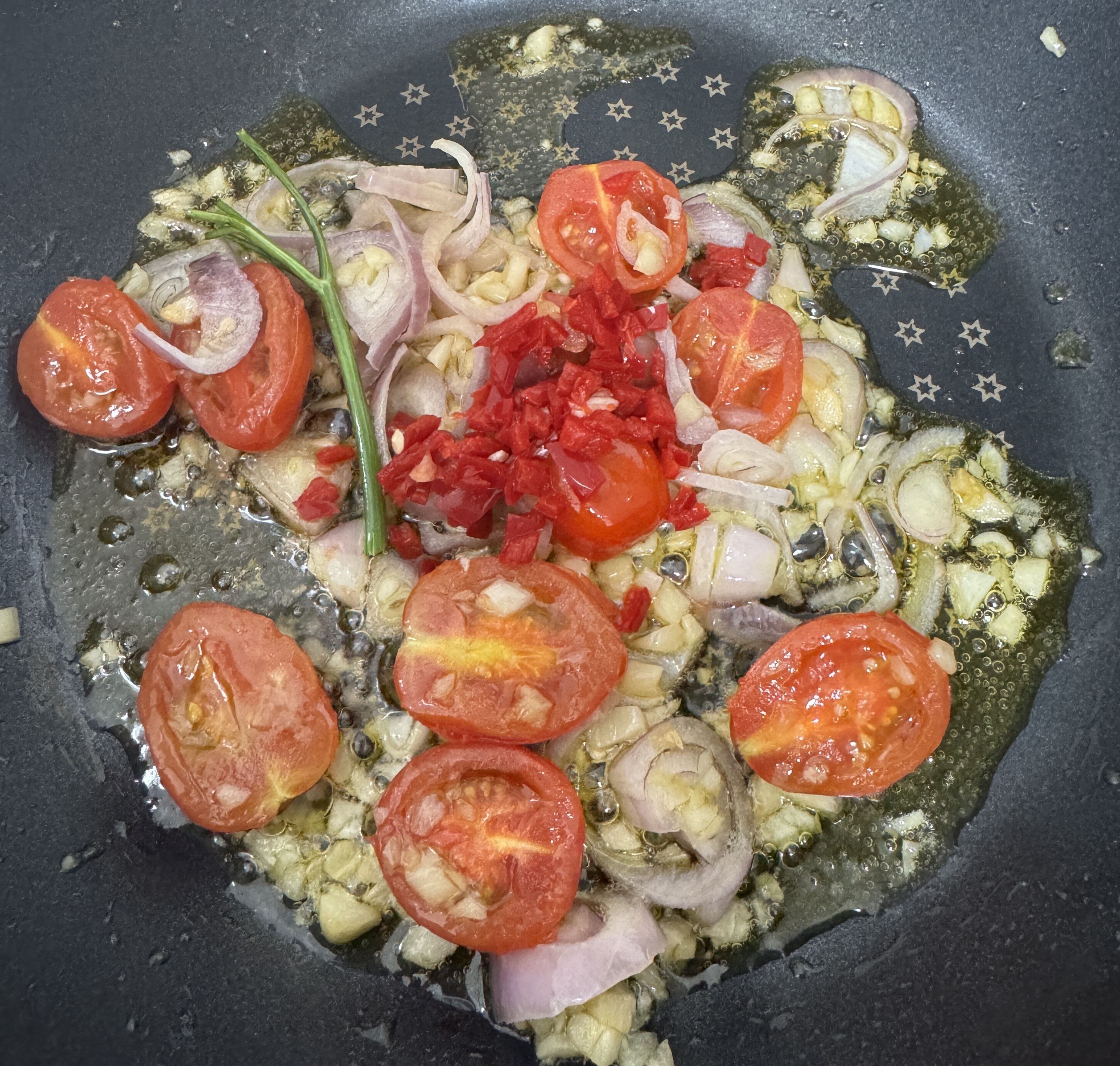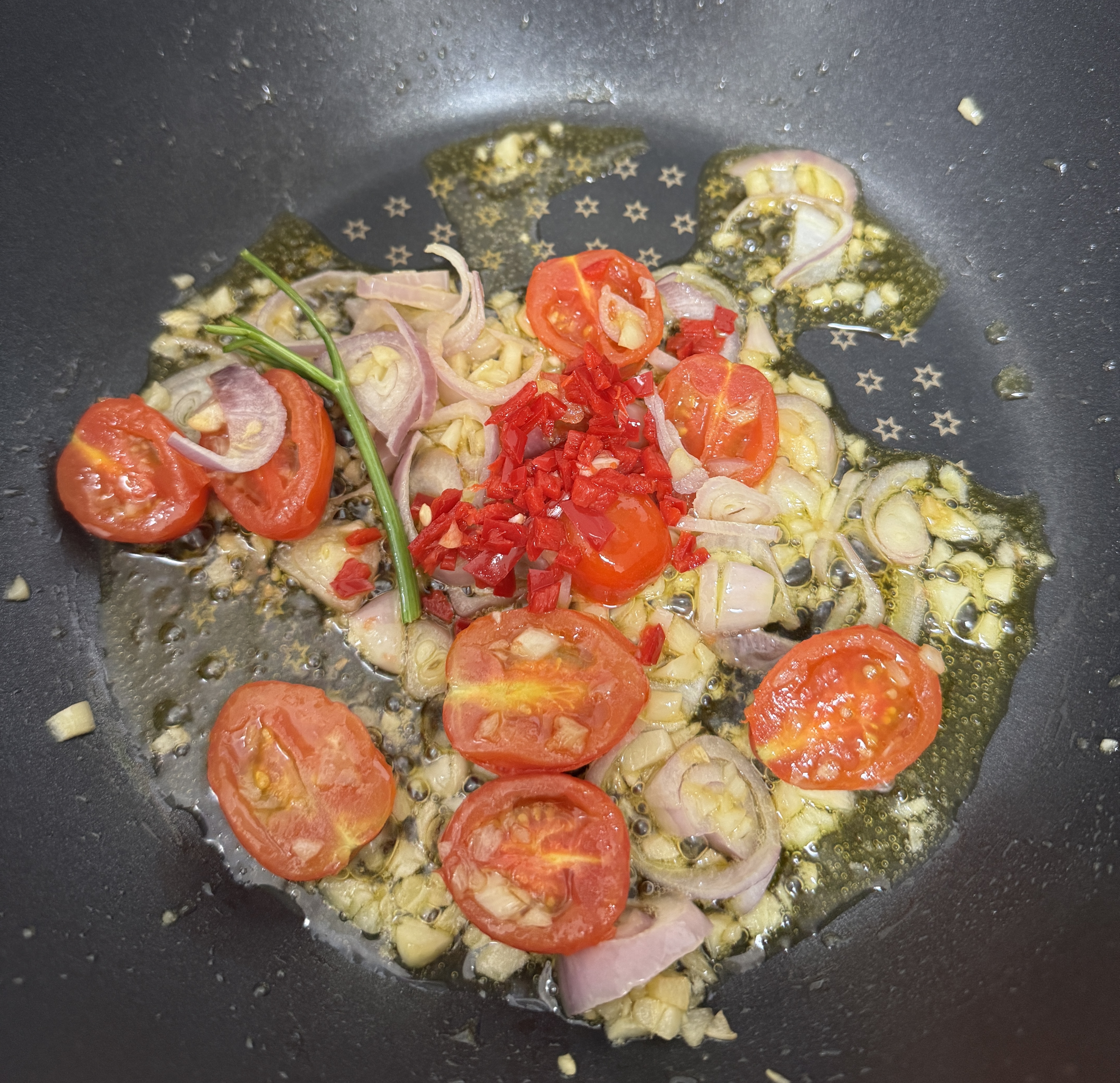 방울토마토, 살롯, 홍고추 넣어서 같이 볶습니다.