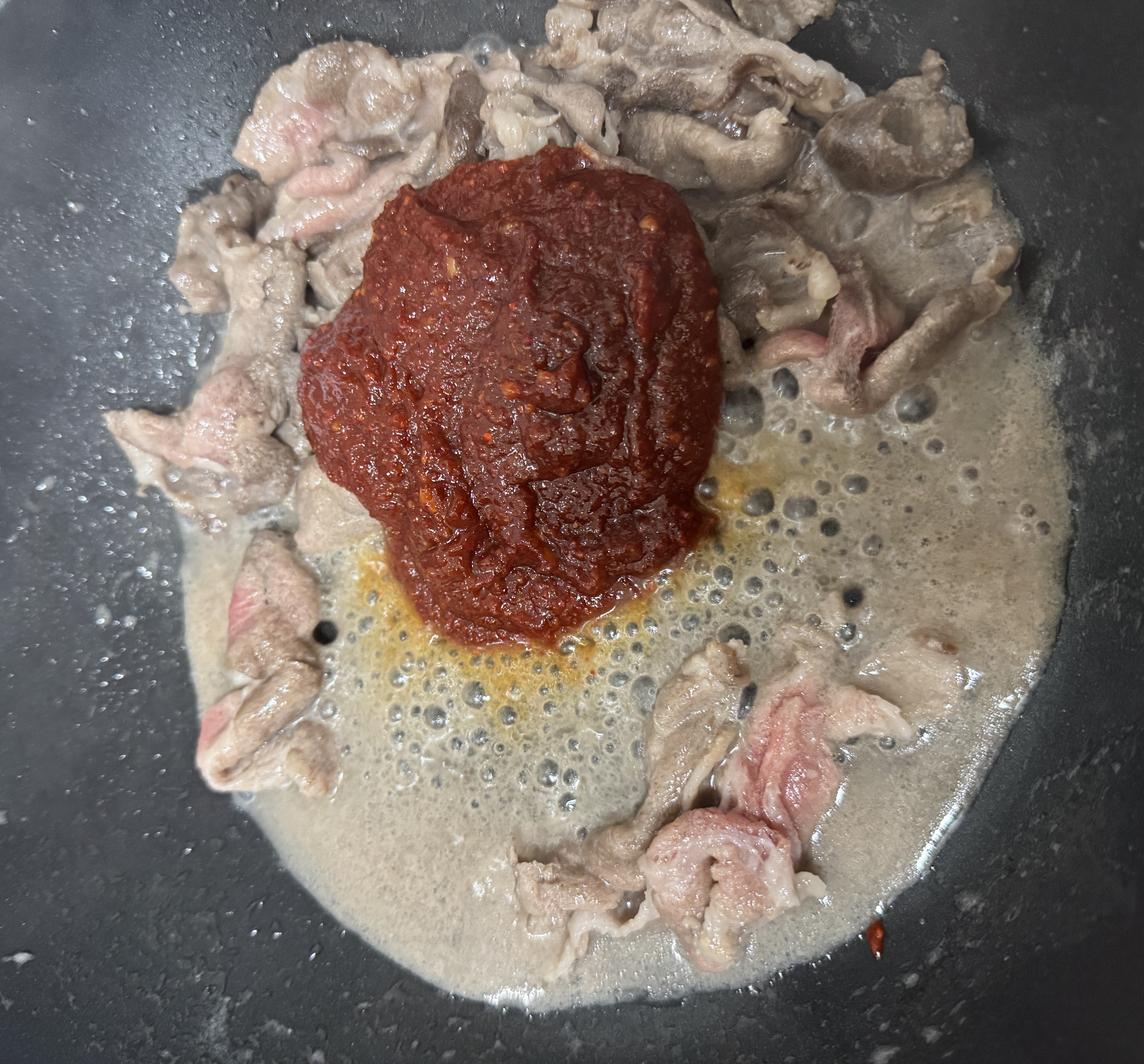 4. 고기가 익어갈 때쯤 만들어준 양념을 넣어줍니다.