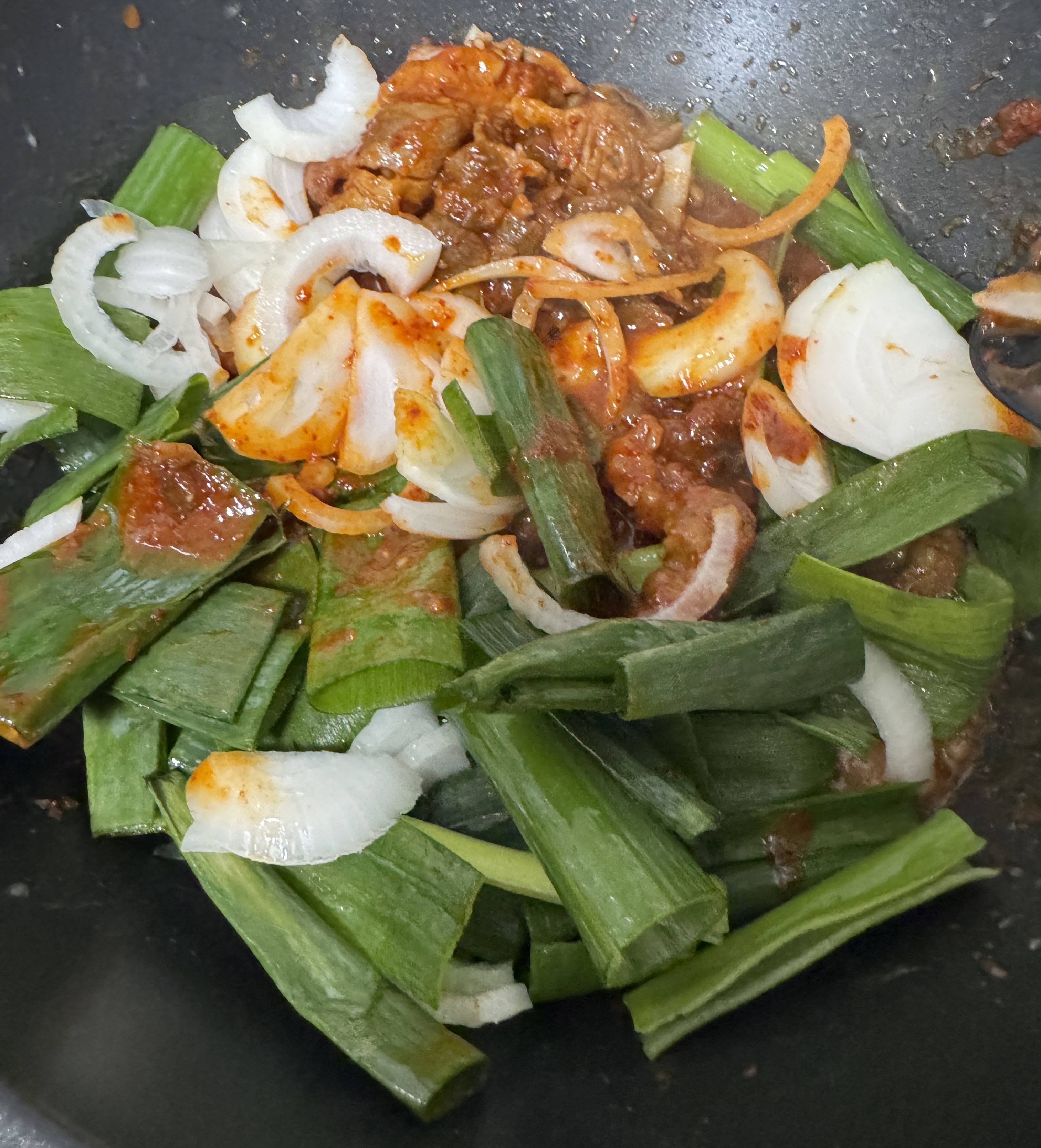 5.고기에 양념을 골고루 묻힌후, 양파와 대파를 넣고 같이 볶아줍니다.