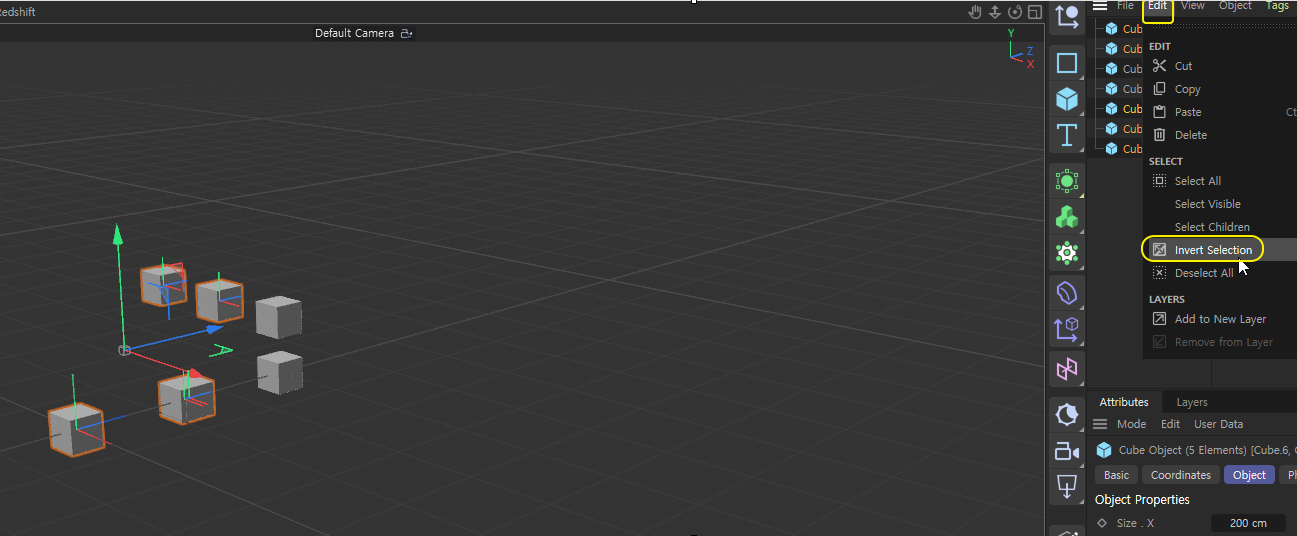 부분 오브젝트가 선택된 상황에서 invert selection 인버트 셀렉션을 클릭하면, 선택되지 않았던 오브젝트가 선택되면서 선택되었던 오브젝트들은 해제됩니다.