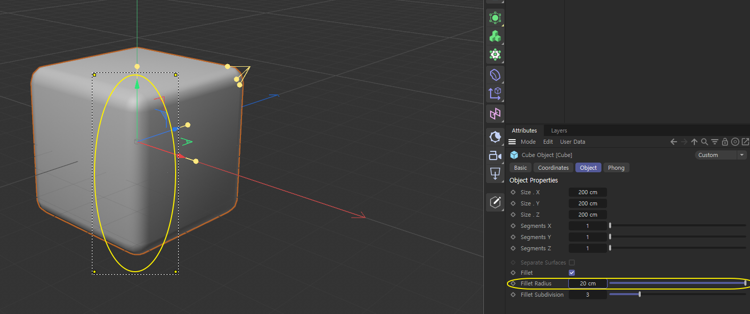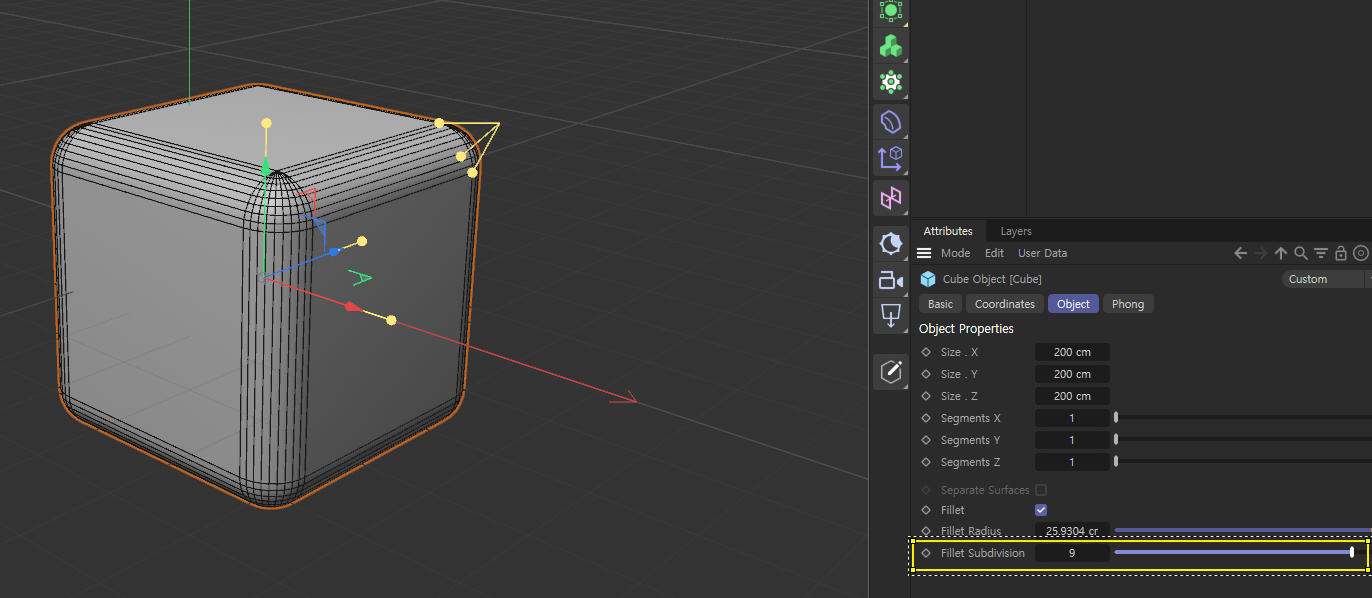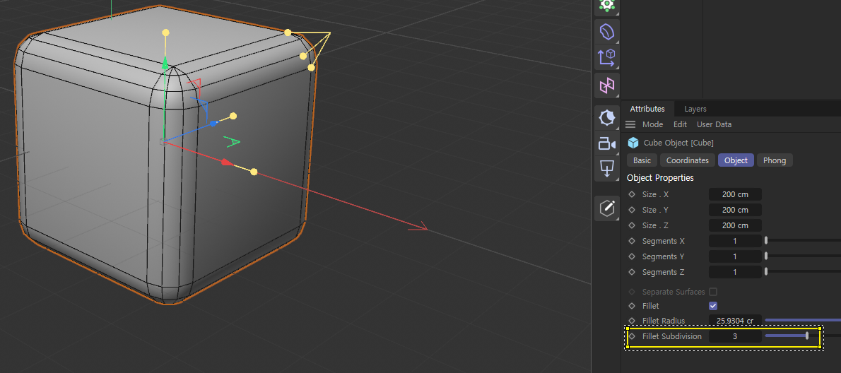 Fillet : 오브젝트 필렛에 체크를 하면 큐브의 모서리가 라운딩 형태로 변합니다.