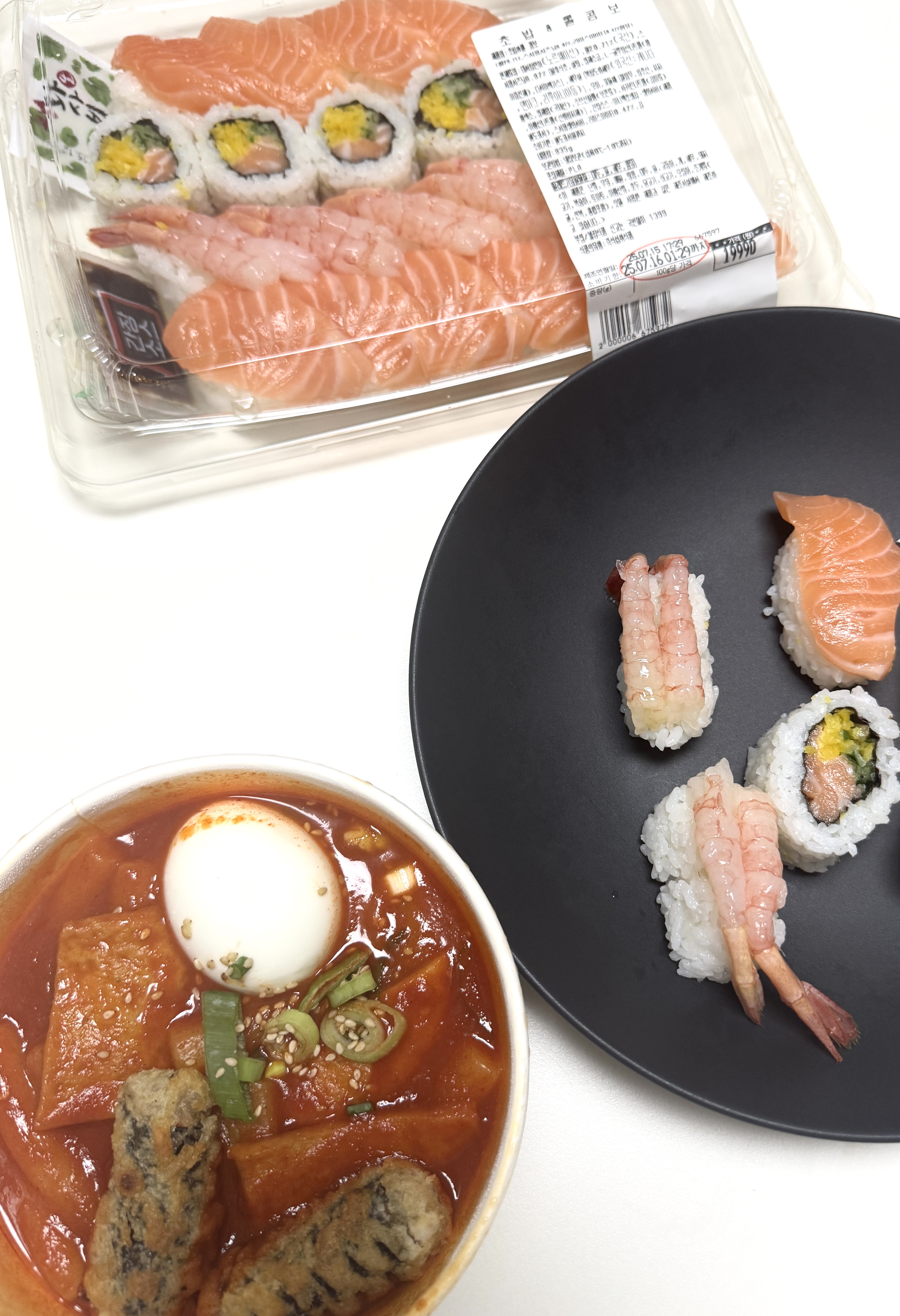 떡볶이랑 초밥롤콤보 구입해서 포장해와서 먹었어요.