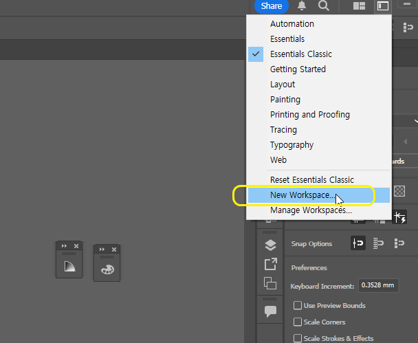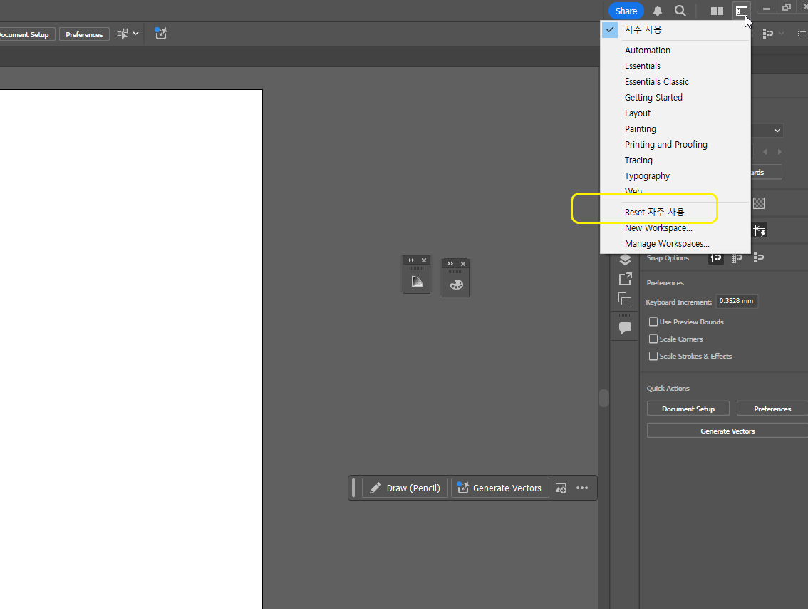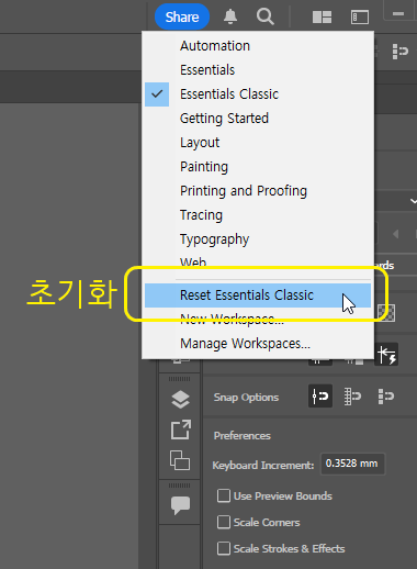 3.일러스트레이터 작업 환경 초기화 (에센셜 클래식, 리셋 에센셜 클래식)