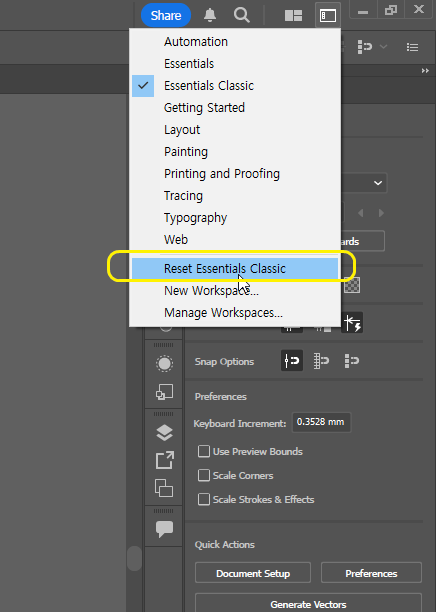 패널 원래대로 돌리려면 리셋 에센셜 클래식 누릅니다.
