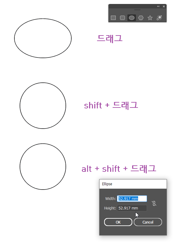 | 정비율 원형 (중심부터 그려짐) | alt + shift + 드래그 |