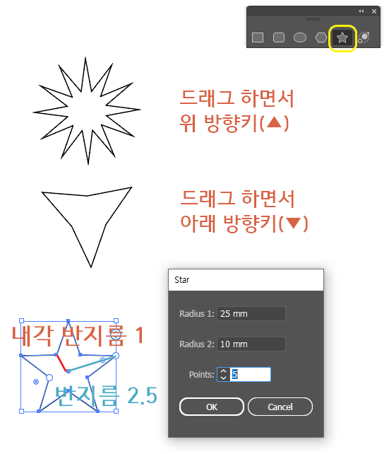 내각 반지름 크기 변화로 별모양 자체가 달라집니다.